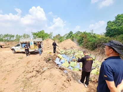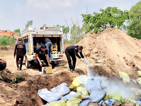 วันที่ 4 มีนาคม 2587 เวลาประมาณ 10.00 น. ร.ต.อ.สุริยนต์ ยุติพันธ์ รองสว. (สอบสวน) สภ.เมืองสรวงและ ร.ต.อ.กิตติภพ ภูสังข์ รองสว.(สอบสวน) สภ.เมืองสรวง พร้อมด้วย ร.ต.อ.วิตร จันทรู รองสว.(ป.)สภ.เมืองสรวง ร้อยเวร 20 ชุดเวรบูรณาการ สภ.เมืองสรวง ร่วมกับ เจ้าหน้าที่ปศุสัตว์อำเภอเมืองสรวง และหน่วยงานอื่นๆที่เกี่ยวข้อง ร่วมกันนำของกลางซากสุกร ทำลาย โดยการฆ่าเชื้อขุดหลุมฝังกลบ ในเขตป่าบ้านเมืองแก้ว ม.2 ต.หนองหิน อ.เมืองสรวง จ.ร้อยเอ็ด